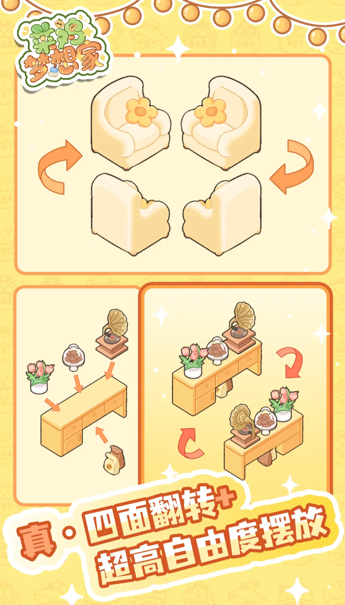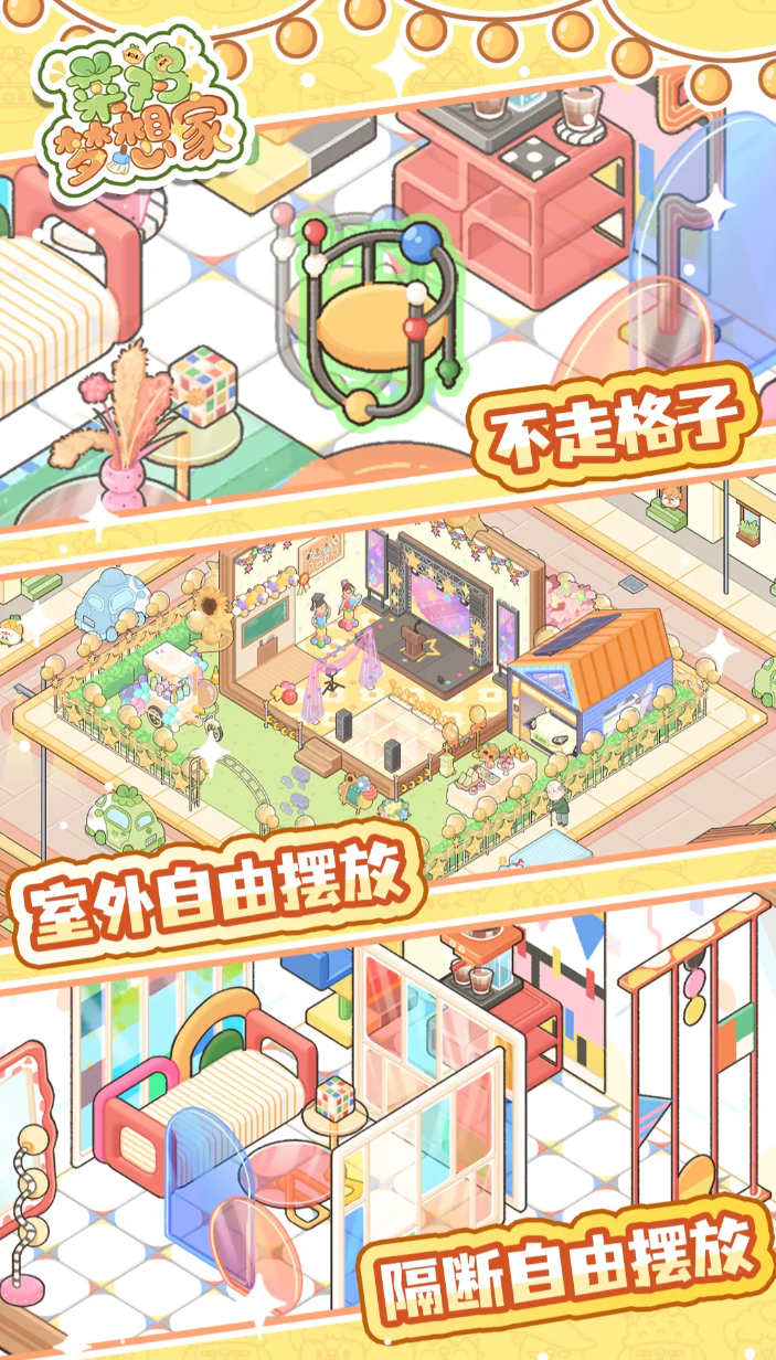 区别于传统室内装修类游戏,《菜鸡梦想家》引入多项创新交互机制:支持家具360度自由旋转摆放;开放“无墙模式”,允许玩家脱离墙体限制,在任意空旷区域自主规划建筑布局;场景风格覆盖中式庭院、现代简约等多种美学体系;内置海量家具组件,兼顾实用性与个性化表达需求,满足不同审美倾向的布置偏好。
