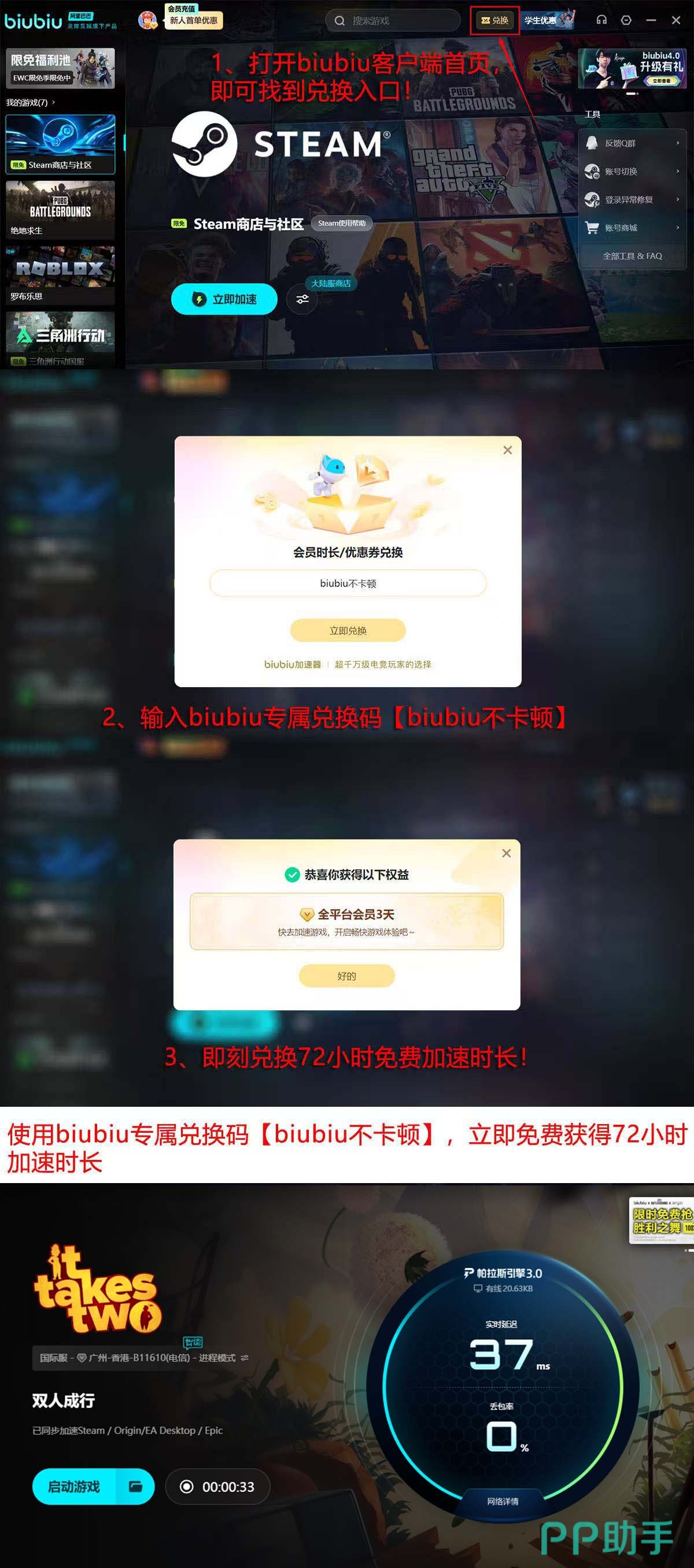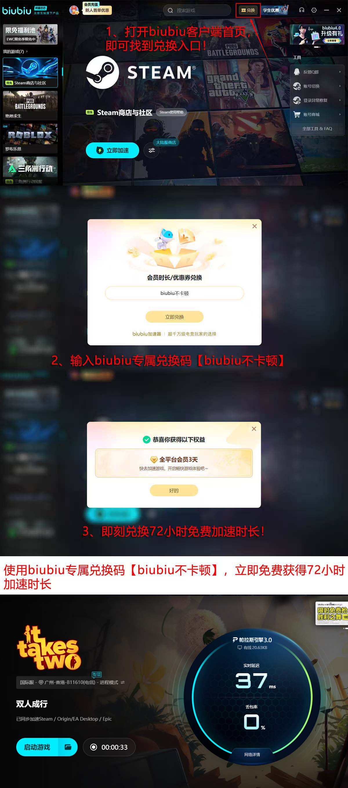 除限免权益外,新用户注册即赠24小时全功能加速时长,无需手动领取;另可通过客户端首页“兑换”入口输入口令【biubiu不卡顿】,额外获取72小时加速权限。两项叠加,总计可享96小时免费服务。若所选游戏处于限免期内,口令时间可延后激活,灵活适配个人使用节奏。