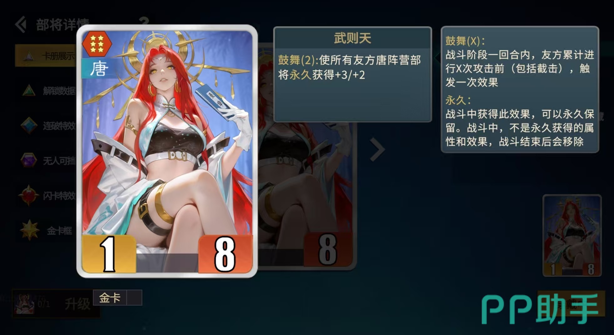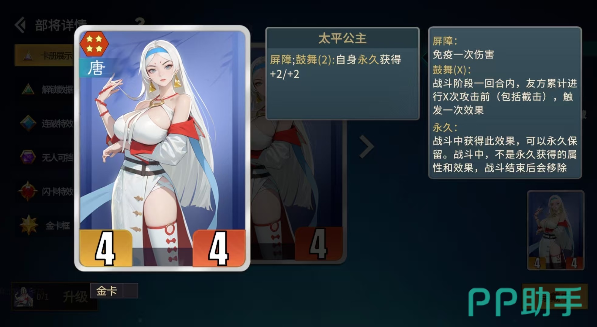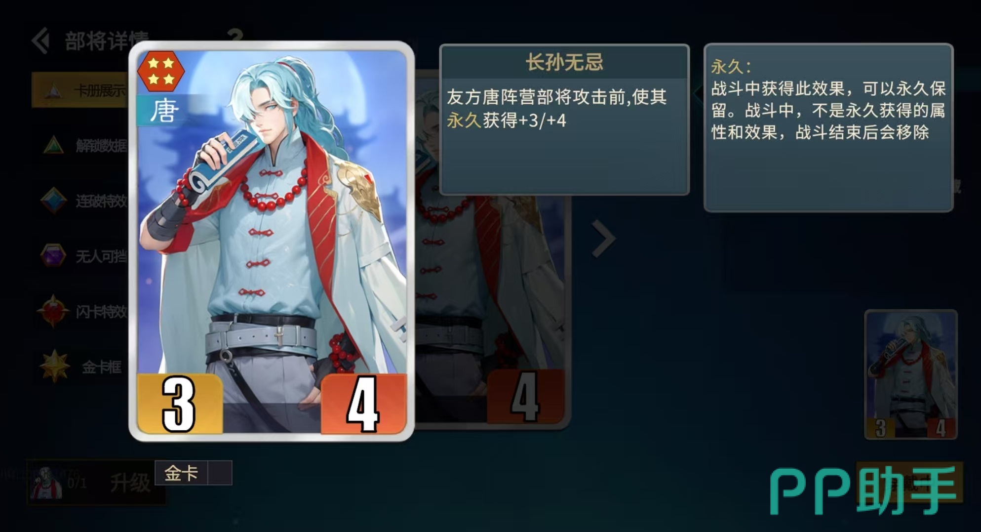 当然除了太平公主之外,其他唐阵营中的卡牌都可以套上护卫当做护卫卡使用,有秦琼截击在前,对方根本伤害不到护卫卡。阵容中还有一张核心卡必不可少,那就是长孙无忌,很多人认为唐阵营的属性叠加核心是武则天,但事实并非如此,长孙无忌对于单一卡属性叠加效率要大于武则天,尤其是在截击流中。长孙无忌的卡牌特点是友方唐阵营部将每次攻击前,都可以获得加3/4的属性提升,金卡更是直接达到了加6/8,对比之下,武则天鼓舞所带来的提升效果要略逊一筹。当然武则天也是必不可少的,因为武则天带来的是整个阵容所有卡牌的属性提升,而长孙无忌只能够对触发攻击的卡牌进行加成。