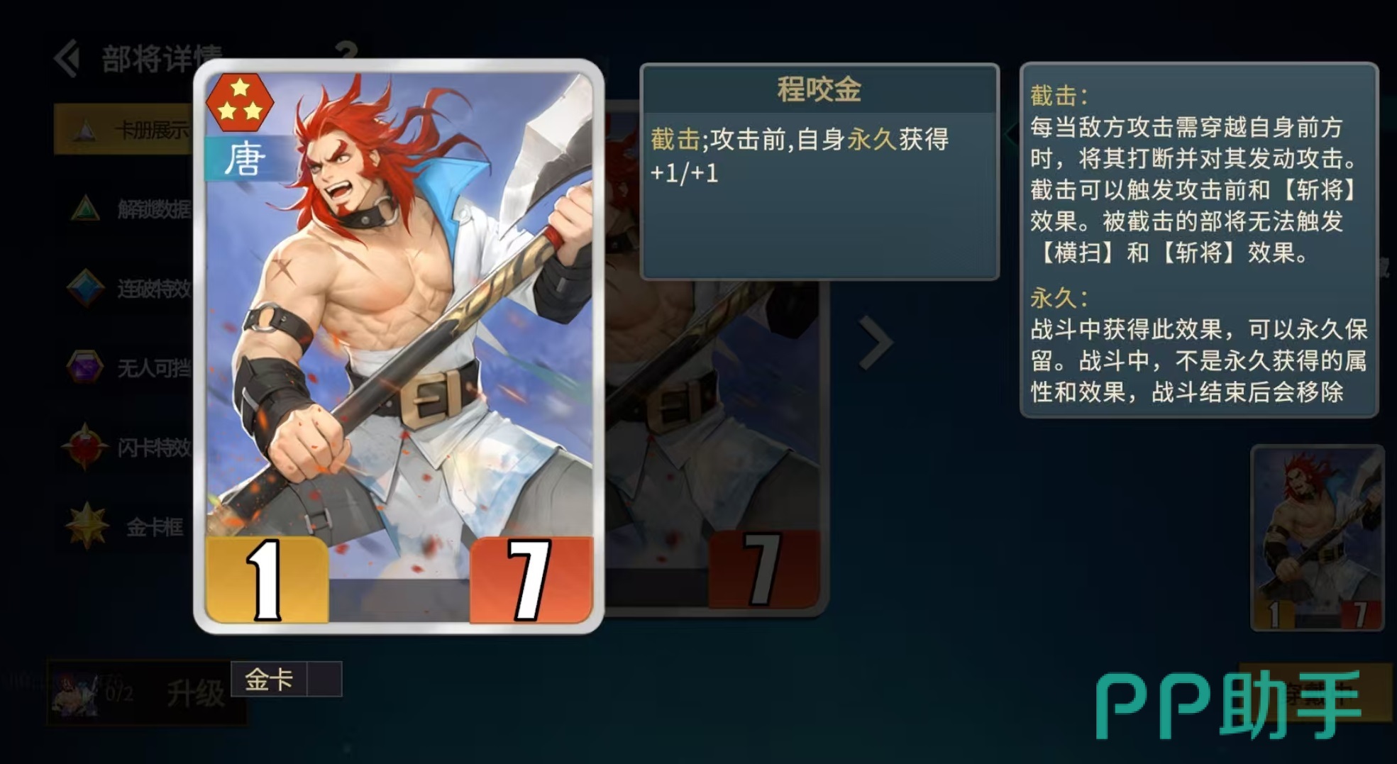 这里还有一张卡要重点介绍,那就是程咬金,截击阵容中程咬金也可以选择,他也具有截击效果,每次攻击发动前自身可以永久获得加1/1,金卡可以获得加2/2。但程咬金相比于秦琼有一个很致命的弱点,就是自身没有屏障,虽然可以将属性叠起来,但是没有屏障的保护,后续被对方的主c很容易一发直接带走。尤其是在面对汉阵营时,没有屏障非常吃亏,这就是截击的核心是秦琼而非程咬金的原因。程咬金前期可以作为过渡使用,有了秦琼之后就需要果断放弃。最后是核心的主c选择李白就可以了,然后再配上一张上官婉儿用于补充部将,或者是配上李元芳触发连击。