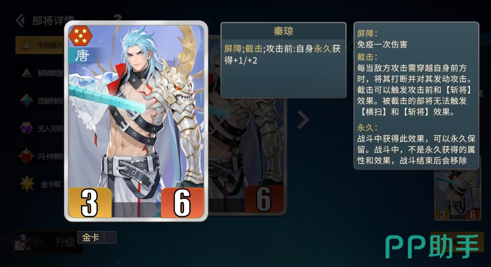 截击流的核心卡是秦琼,秦琼的特点是屏障和截击,在攻击前自身永久获得加1/2的效果,如果是金卡,则属性加成变为加2/4。因为自身具有屏障,所以可免疫一次伤害,截击的效果是每当敌方卡牌攻击需要穿越自身前方时,就可以直接对其进行打断,并发动攻击。截击可以触发攻击前和斩将效果,被截击的部将无法触发横扫和斩将效果。秦琼通过攻击前获取到的属性是永久效果可以直接保存。所以通过不断的触发截击,秦琼自身的生命值和攻击力会越叠越高。