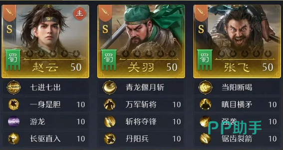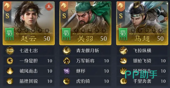 比如说赵云主将加关羽和赵飞,都带上枪兵,3S枪兵10%属性加成组成主动枪。也可以把张飞换成马超,都带骑兵来组3S骑兵,这里关羽是纯辅助位置了,由马超和赵云提供主要输出,而且这个阵容相对来说容易凑,pvp也不差。