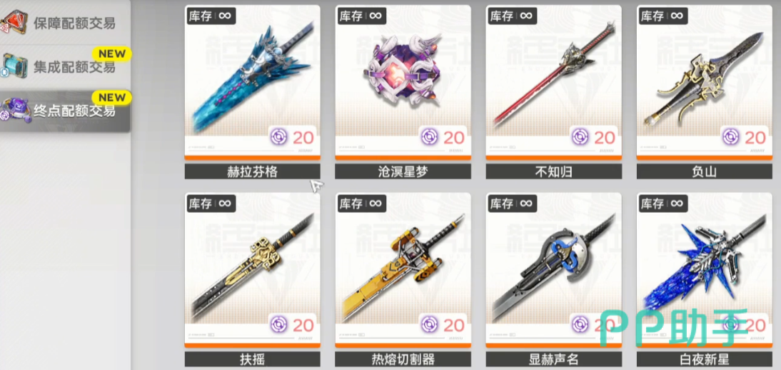 最后再来讲一下终点配额交易,这里的商店就是用来兑换武器的。要是大家有溢出的六星信物,就可以用来兑换为该商店的货币。然后就能随心兑换自己所需要的武器了,只不过一个歪了的六星信物只能换取十个货币,所以性价比不高,大家要慎重兑换。也就是说,想要获取一个角色的专武,那就要用两个没用的六星信物去兑换。这里建议大家兑换自己主C的专武即可,同样能获得巨大的战力加成!