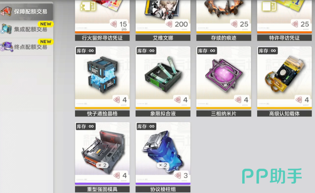 接着就是集成配额交易了,这个地方建议用于兑换已经抽到角色的信物,因为这些信物都可以拿来提升自己角色的阶级或者经验值。要是溢出的话,就全部拉满就可以了,也能让他们更快提升等级,获得更强大的战力!有了之后就可以用来换取各种各样的资源,主要是看自己缺少什么物品,就直接兑换就好了!