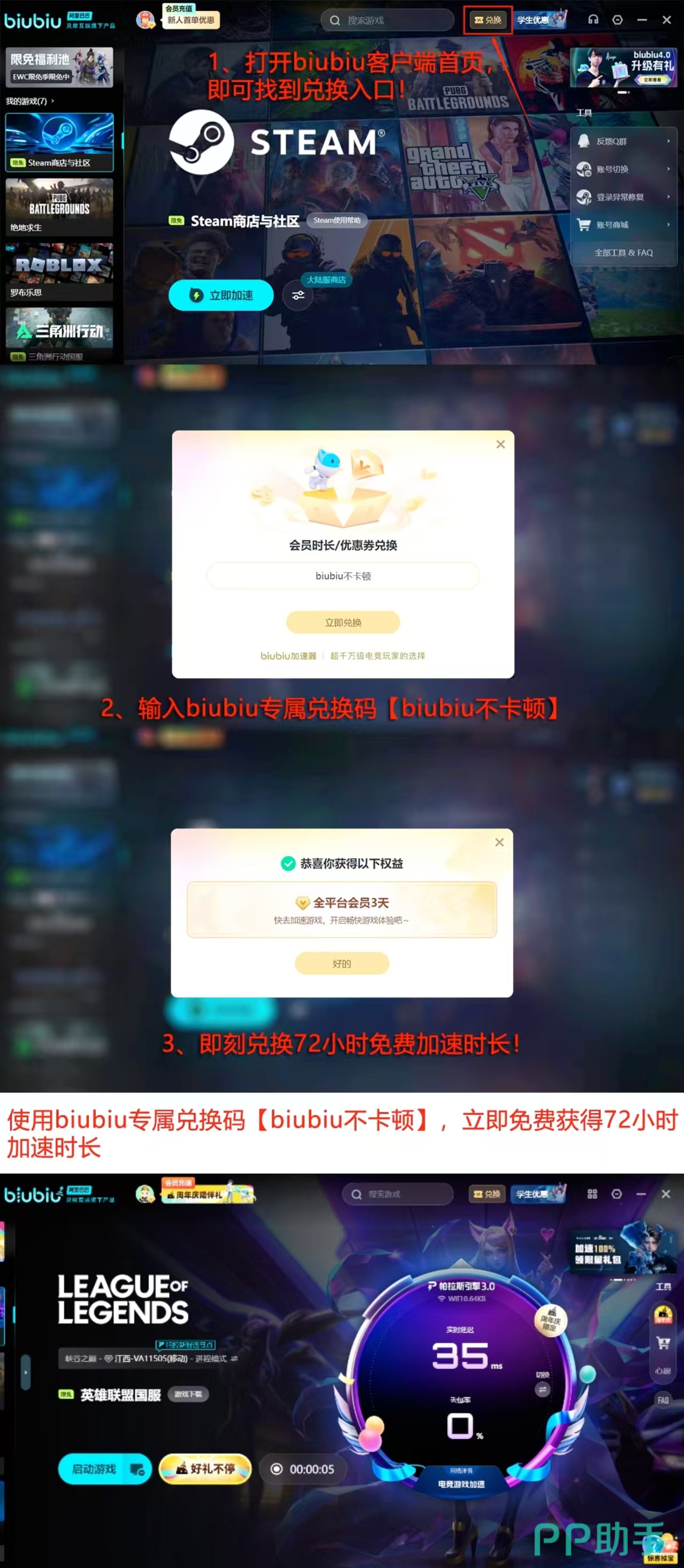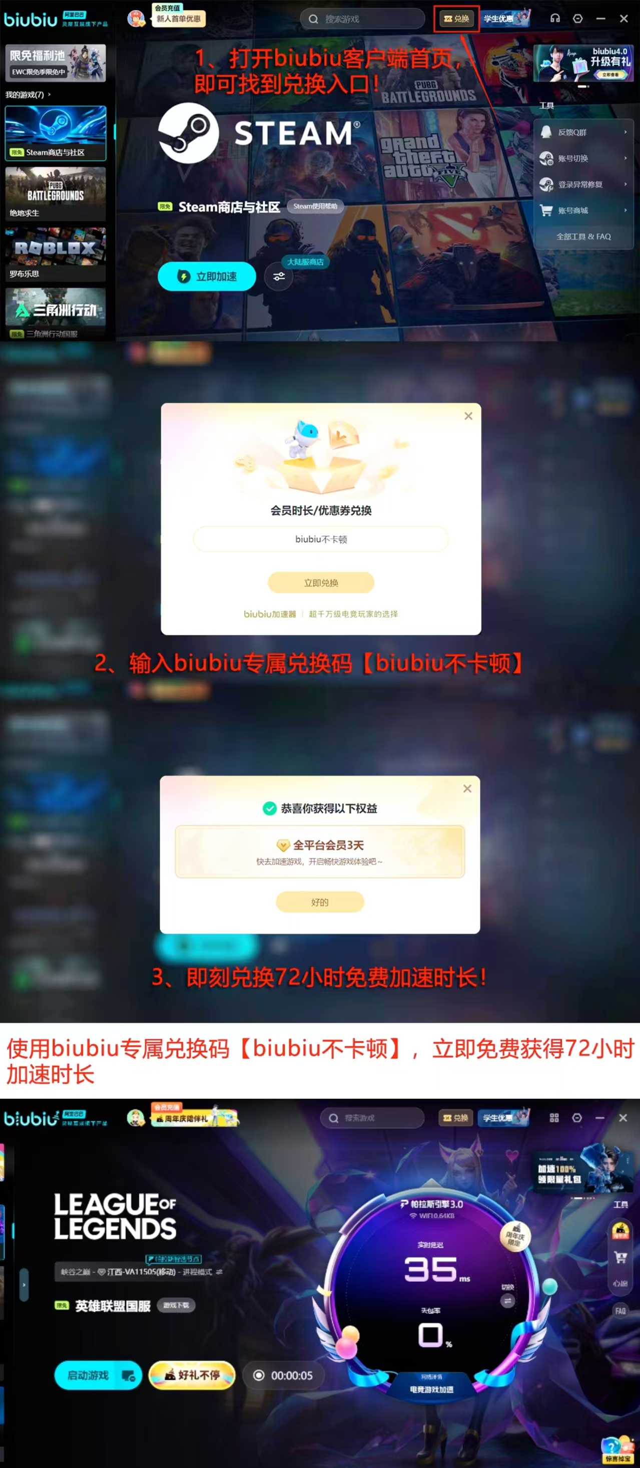新用户注册即赠24小时全功能免费加速时长;输入专属兑换码【biubiu不卡顿】还可额外领取3天连续加速权限,总计96小时无限制使用,充分满足新手熟悉游戏机制及完成初始任务的需求。该兑换权益对老用户同样生效,每位账号限用一次。