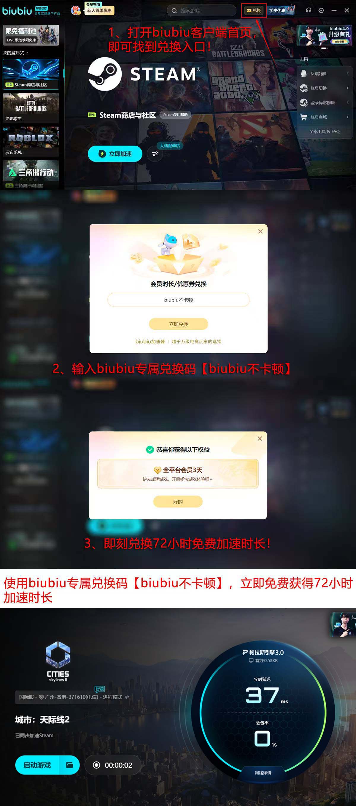 启用biubiu加速器后,玩家将直观感受到登录验证耗时缩短、创意工坊刷新响应提速、大型MOD加载失败率大幅下降,整体运行稳定性获得质的提升。目前该工具提供完整免费试用期:新注册用户可即时获得24小时新手体验时长;输入口令【biubiu不卡顿】参与首页兑换活动,还可额外领取72小时使用权,累计达96小时。