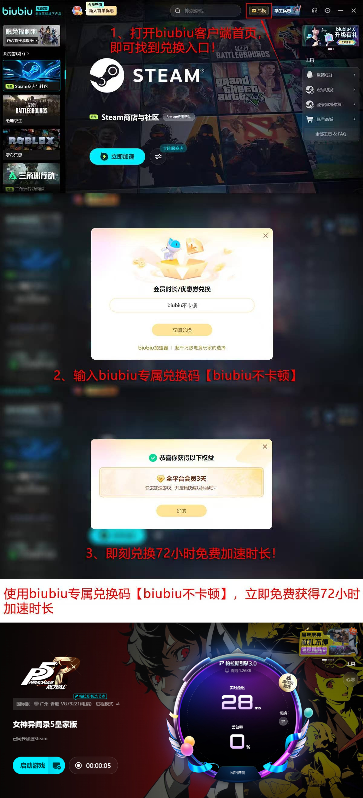 即日起至2025年1月18日,biubiu平台启动冬季加速服务限时活动。活动期间,《女神异闻录5 皇家版》等热门大作开放专属高速资源池。新用户完成注册后,立即获赠24小时全游戏通用加速权益;叠加参与【biubiu不卡顿】任务,还可额外解锁72小时无门槛畅玩加速时长,总计享受96小时免费稳定加速服务。