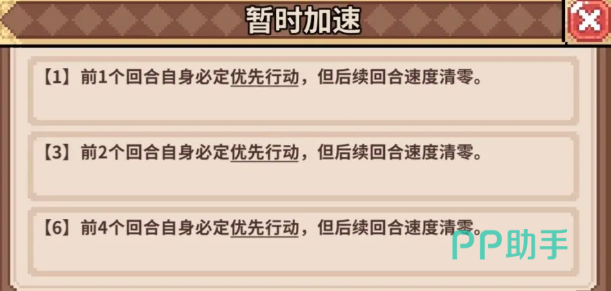 暂时加速能在前一个回合让自身必定优先行动,但后续回合速度会清零,简单来说也就是带来先手效果,先手对于回合制游戏的重要性还是很高的,所以是全角色通用。