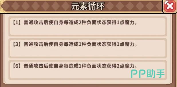 元素循环能在普通攻击后,使自身每造成2种负面状态就得到1点魔力,这个是法师必带装备。