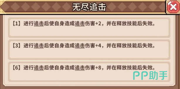 无尽追击能在进行追击后,让自身造成的追击伤害加2,并在释放技能后失效,这属于射手最强的增伤装备。