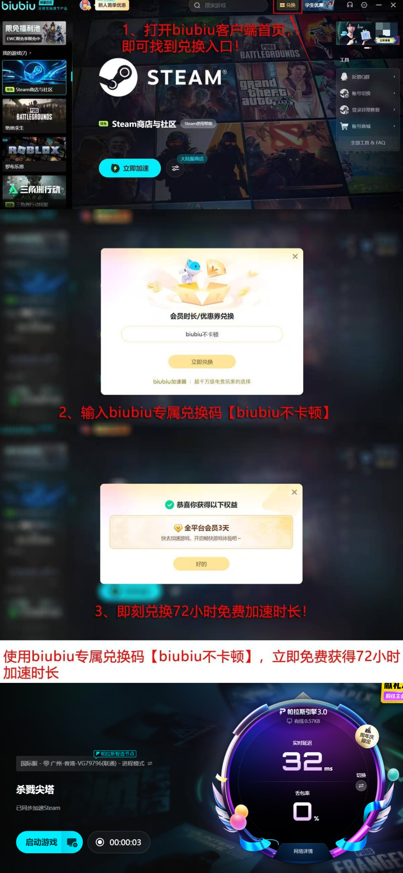 有意向尝试的用户可直接下载安装,针对首次使用的顾虑,平台设置了分层试用机制:注册后自动获得24小时全功能加速权限;如需进一步验证,还可通过手动输入口令【biubiu不卡顿】领取额外72小时体验时长,该权益面向所有新老用户开放,无需绑定支付方式。