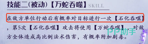 然后是2技能“万蛇吞噬”,也是核心输出节奏技,在敌方单位行动后有概率触发石化进行追击,这种敌动反击机制,使其在多动症敌人的环境中有着很高的收益。石化吞噬累计触发5次会直接释放万蛇吞噬,一次全体高倍率法术伤害,并概率挂毒,这种设计让美杜莎在中后期开始会逐渐“发威”,清场越来越强。