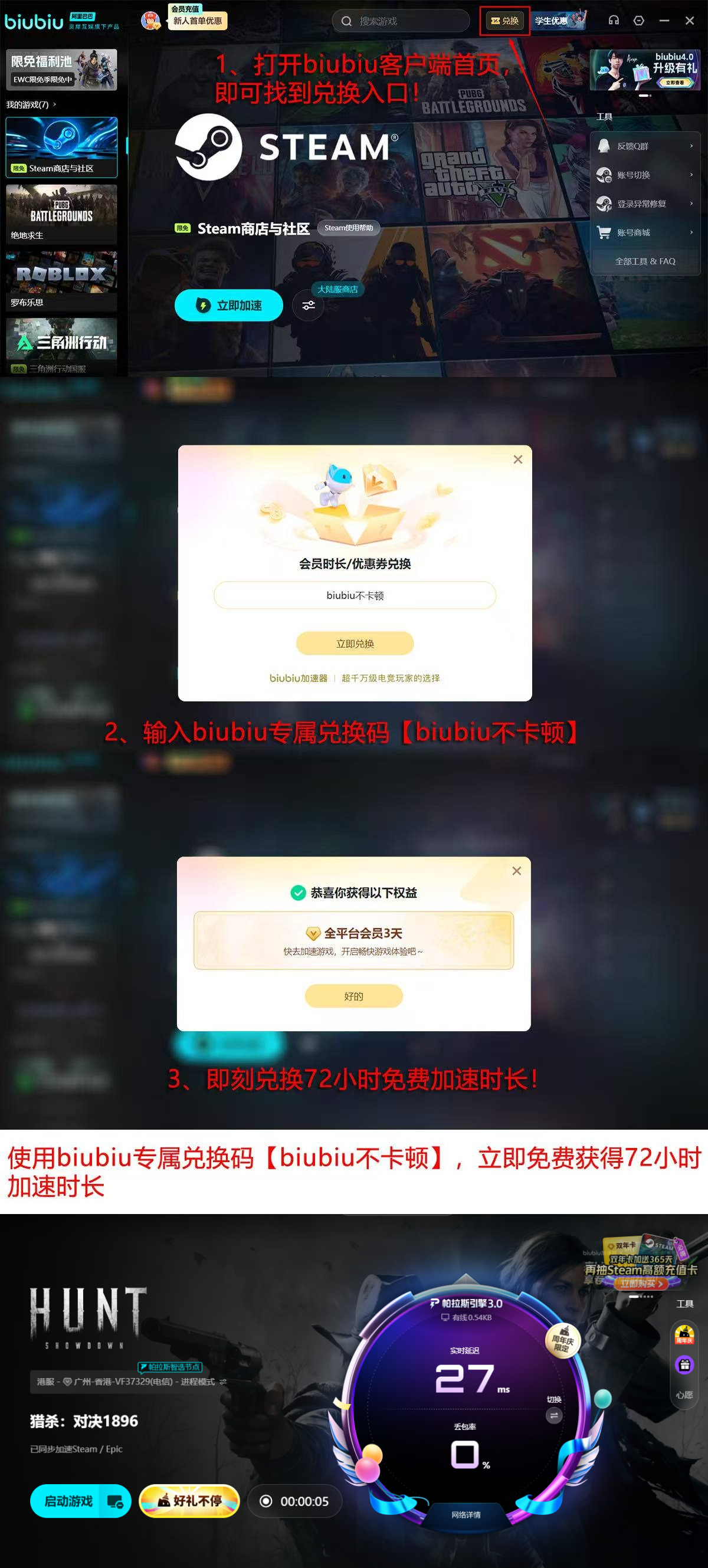 本次冬季促销活动周期为12月18日至次年1月18日,期间开放限免资源池内全部游戏加速权限。新注册用户享有专属权益:完成首次登录即赠24小时基础加速服务;输入激活码【biubiu不卡顿】可额外领取72小时高品质加速时长,总计免费可用时长达96小时。