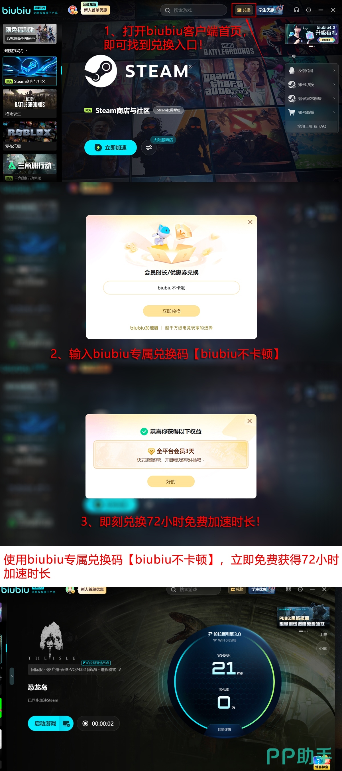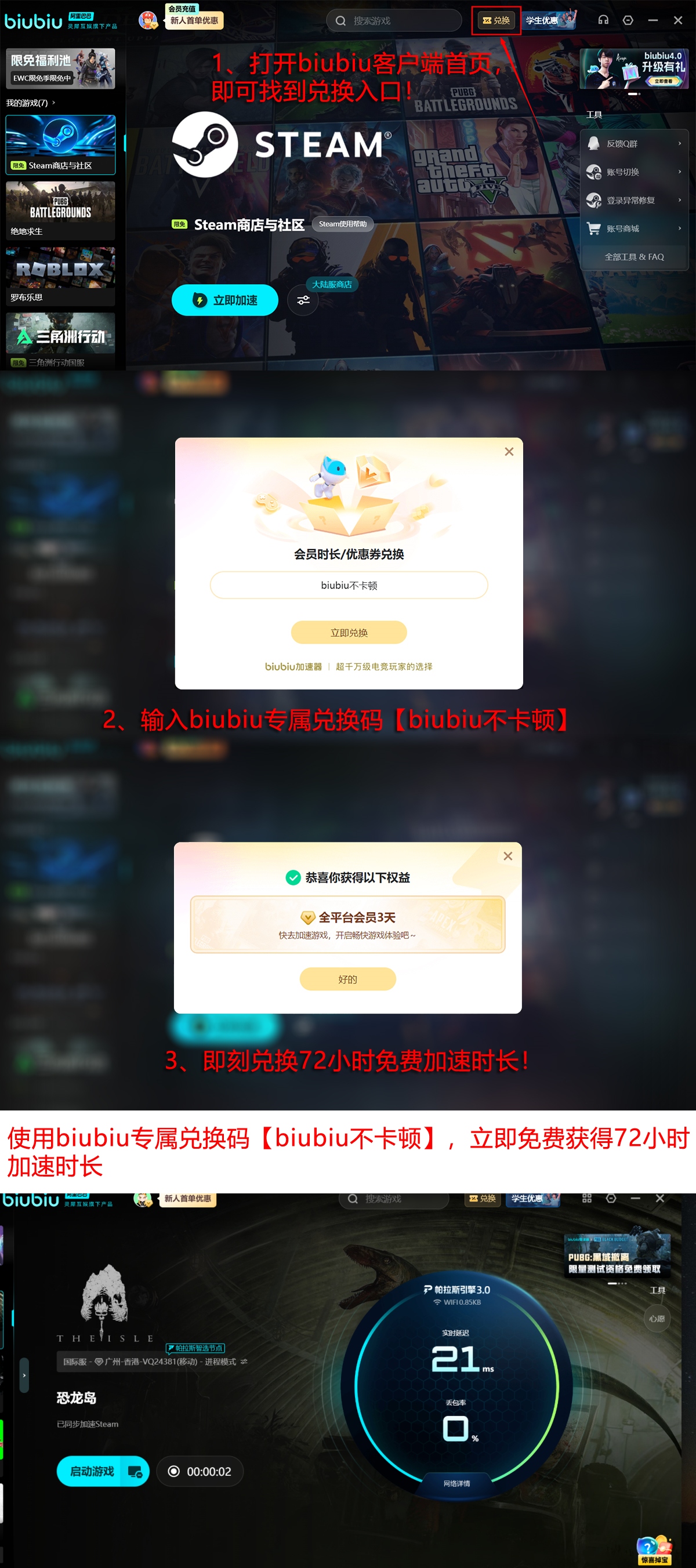 目前,biubiu加速器面向新用户提供首登即享24小时免费加速权益,零门槛验证网络优化效果。所有用户(含老用户)均可通过首页输入兑换码【biubiu不卡顿】领取额外3天加速时长。服务期满后支持灵活续费,且平台持续开放多款热门游戏限免加速资源,综合使用成本具备较高性价比优势。