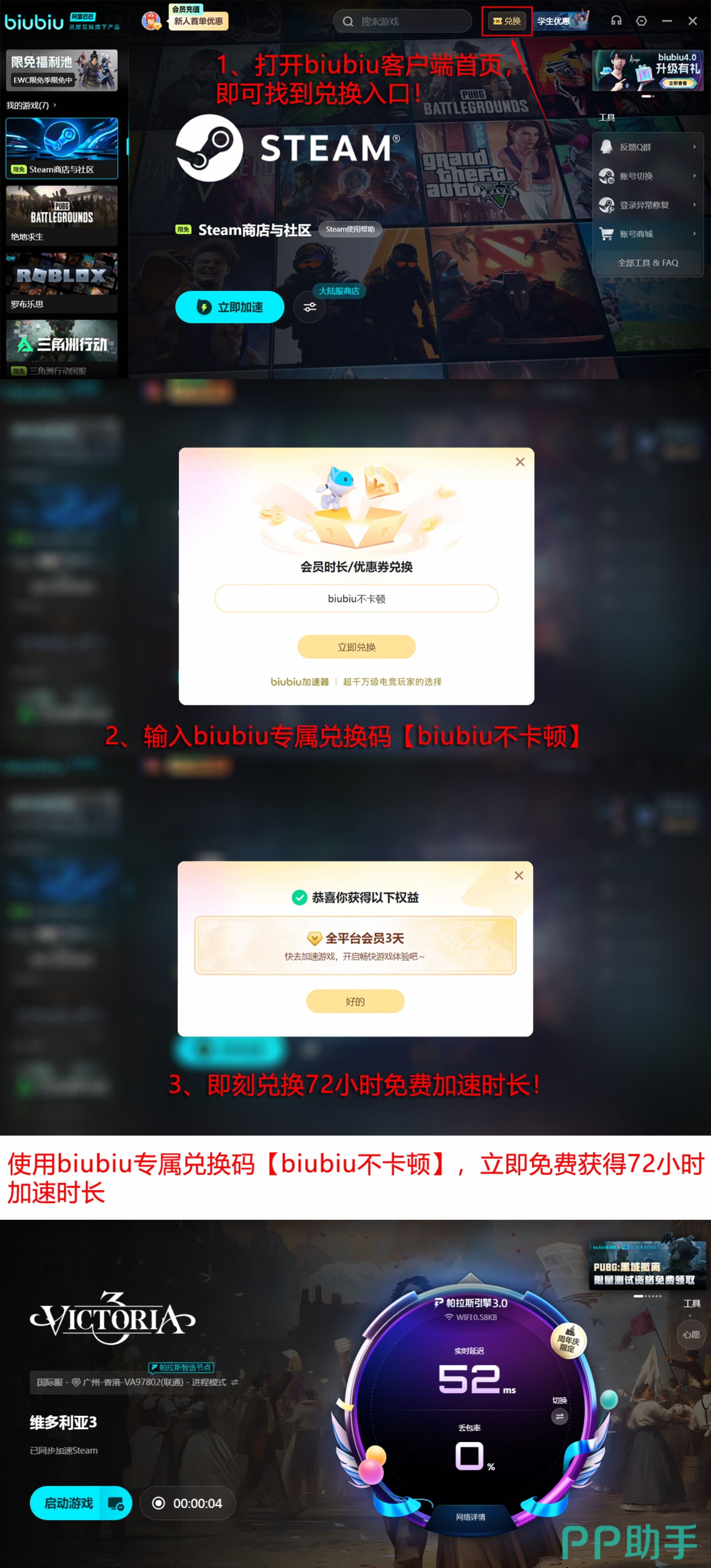针对新用户群体,biubiu加速器同步推出限时激励政策:完成首次注册即可获赠24小时免费加速时长;所有用户(含新老)均可通过软件首页输入兑换码【biubiu不卡顿】,额外领取3天连续加速权益。两项福利叠加后,新用户最高可累计享有96小时无限制加速服务,充分覆盖试玩、入门及中前期深度体验阶段。