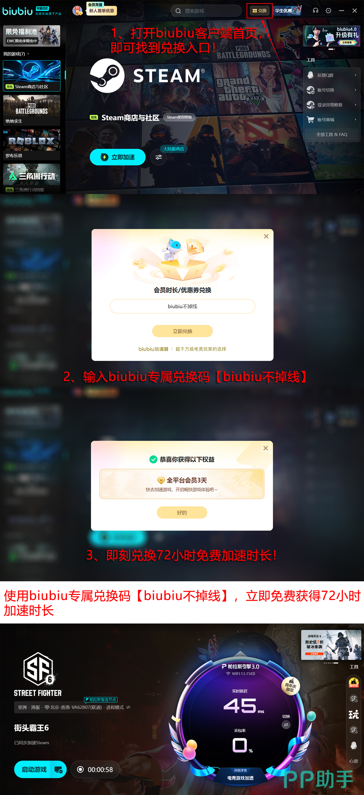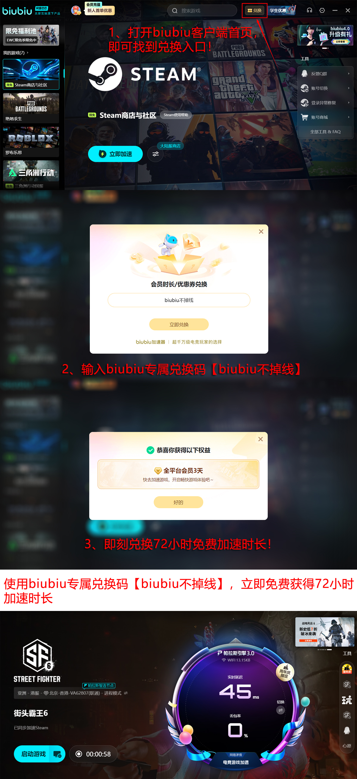 当前新用户注册可享多重限时福利:输入专属激活码【biubiu不掉线】立即获得3天加速时长;完成首次登录后系统自动赠送24小时基础服务,累计可免费体验达96小时。此外,配合冬季促销活动,即日起至1月18日,用户可在Biubiu限免池中一键领取指定免费游戏,并同步享受对应加速服务支持。