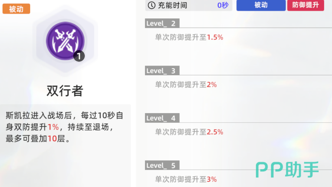 先来看看她的普攻,舞动双剑范围斩击造成最高368%倍率的物伤。特则是以自己为中心进行华丽的多段斩击,对周围敌人造成最高438%的物理伤害。然后是重点看看她的被动,入战之后每隔10秒就可以提升自己1%(3%)的双防,最多叠10层。