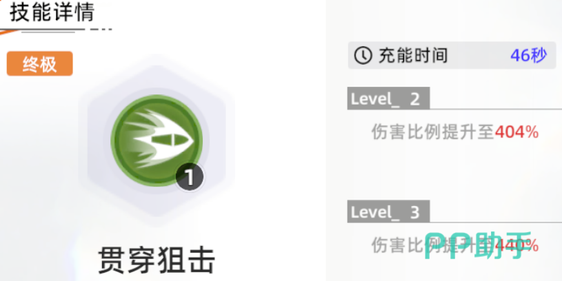 其普攻是在远处使用重型狙击枪打击单体目标造成高额的物理伤害,升级可以提升伤害倍率。特技是连续狙击,朝着前方发射3枚强力狙击弹,造成高额倍率的物伤,同样升级可以提升伤害倍率。
