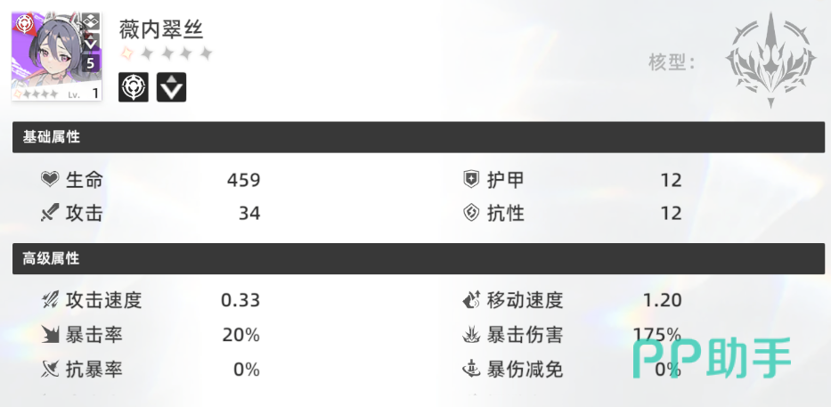 薇内翠丝是属于终结类型的角色,SR品级,花费5,地面型,可以对地攻击。其基础血量不错,有着3000多,攻击力有200+,护甲和抗性中等,都在80左右。