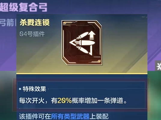 最后一个芯片选择杀戮连锁,该芯片的作用就是有概率发射另一个弹道,对于弓箭类型的武器也是很有作用的,因为在攻击的时候可能很容易触发第二个弓箭,同时还能跟其他的芯片搭配,从而再次加强火力,虽然概率不算很高,但是对于弓箭武器来说还是很重要的。
