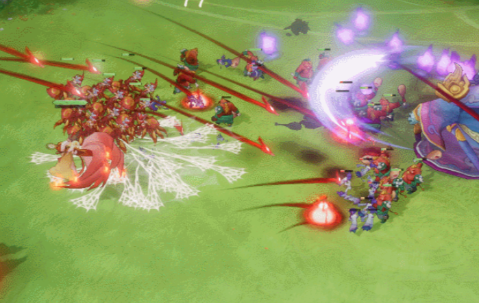 在拥有自走棋玩法的同时,本作最为直观的亮点就是用战场代替了传统棋局,将角色们的战斗搬到了更加开阔的的大战场上,让玩家能直观看到成百上千个单位同屏厮杀的场景,以及救苦天尊召唤法阵、紫府老君用葫芦吸入敌人的技能特效,极大增加了自动战斗的观赏性和沉浸感。