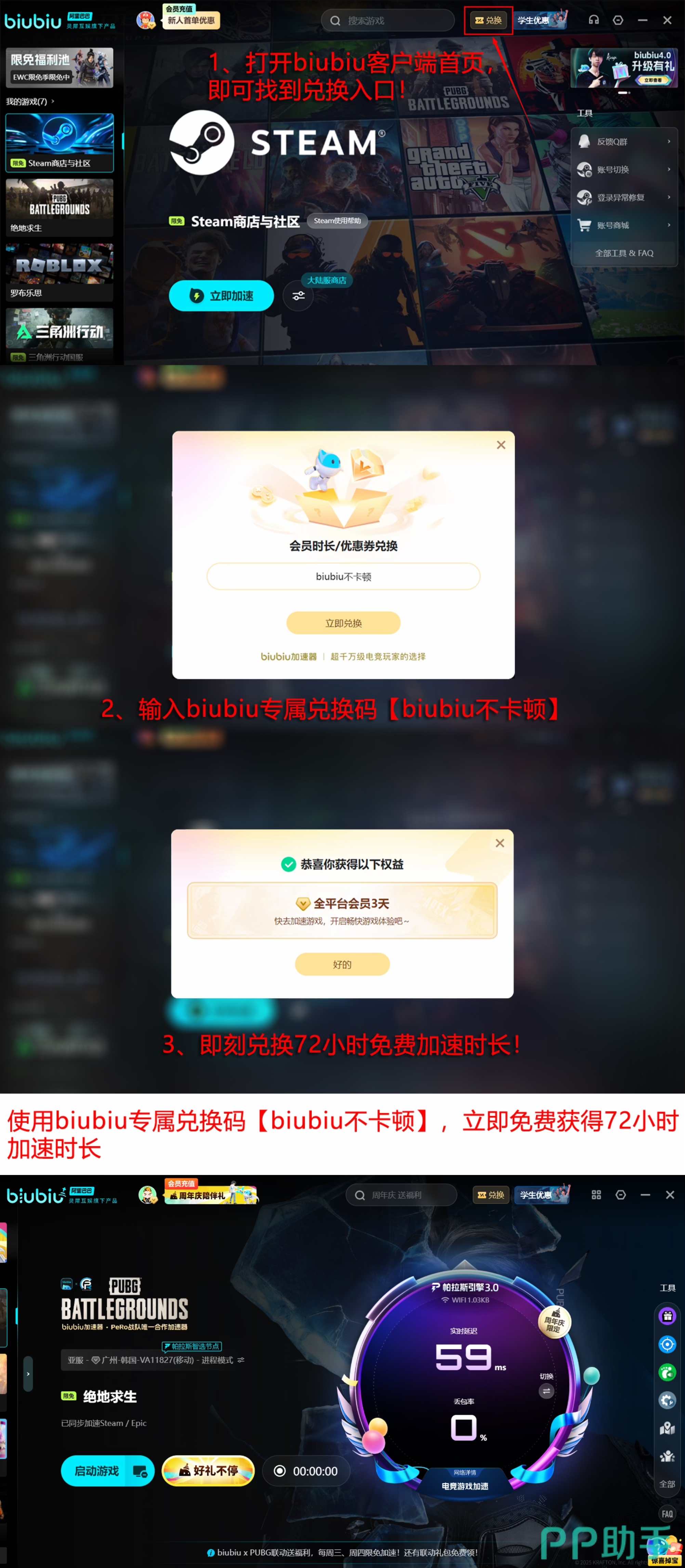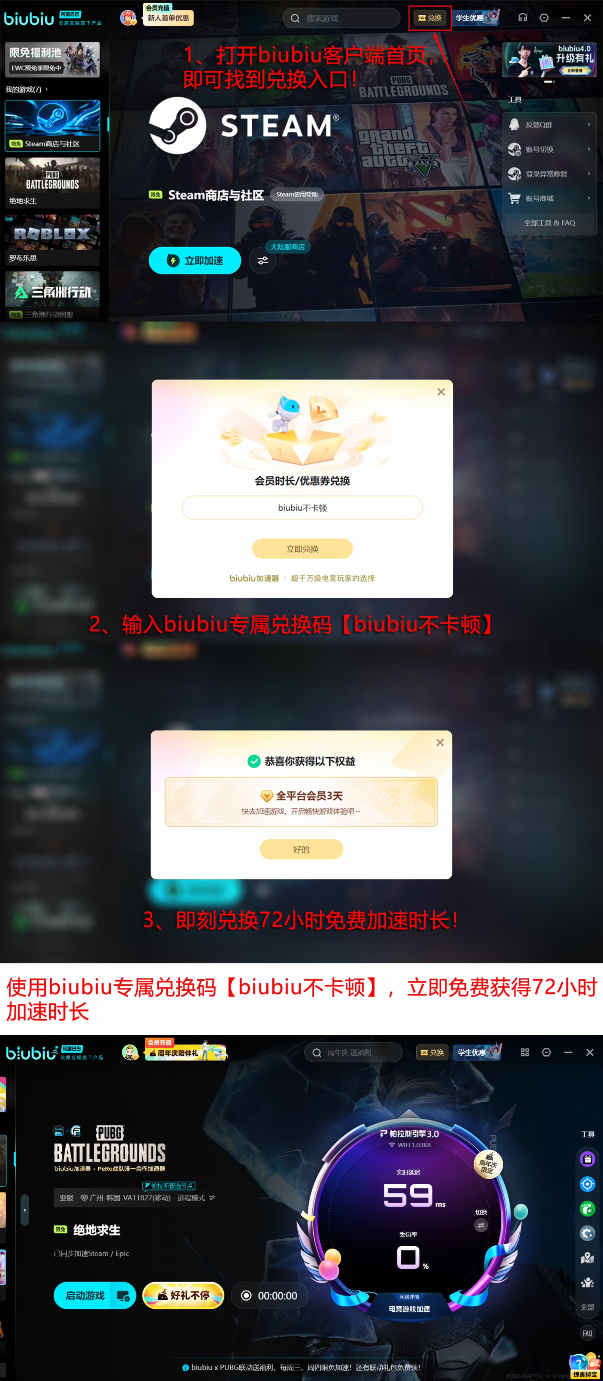 针对新用户试用需求,平台同步开放两项限时权益:完成注册即可获赠24小时全游戏加速时长;另提供通用兑换码【biubiu不卡顿】,所有用户均可领取3天加速服务。新用户可叠加使用,总计享有96小时完整体验周期,充分验证其在PUBG中的实际表现效果。
