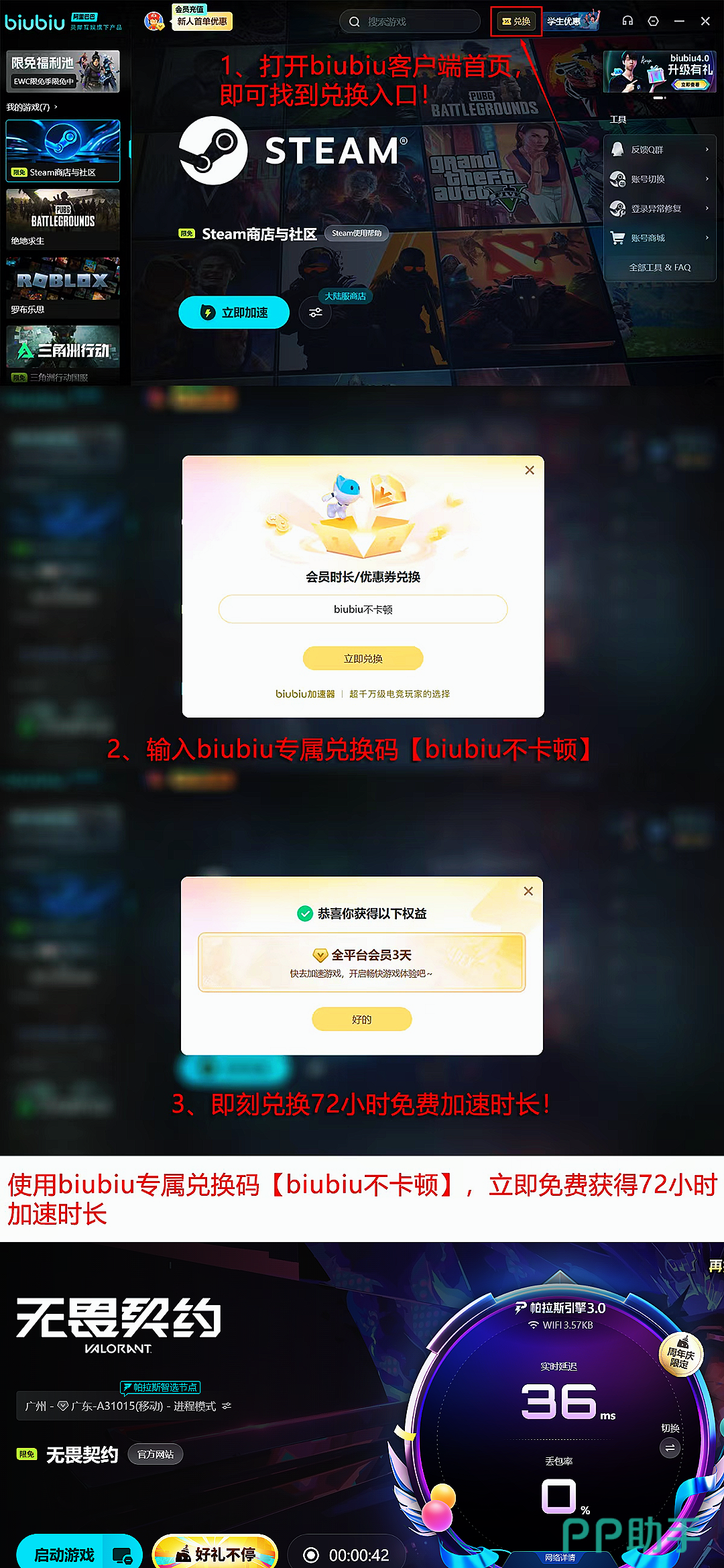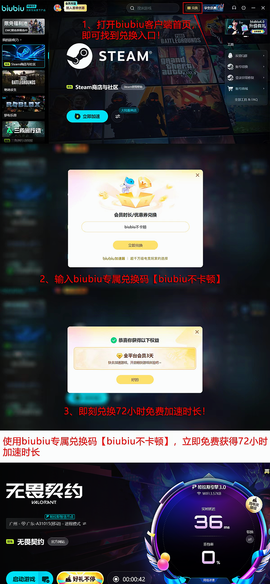 新手用户亦可快速获得高质量体验:完成注册即可领取24小时全游戏免费加速权益;输入兑换码【biubiu不卡顿】还可额外激活3天连续使用权,总计享96小时加速服务。该福利同样向老用户开放,无需额外条件限制。