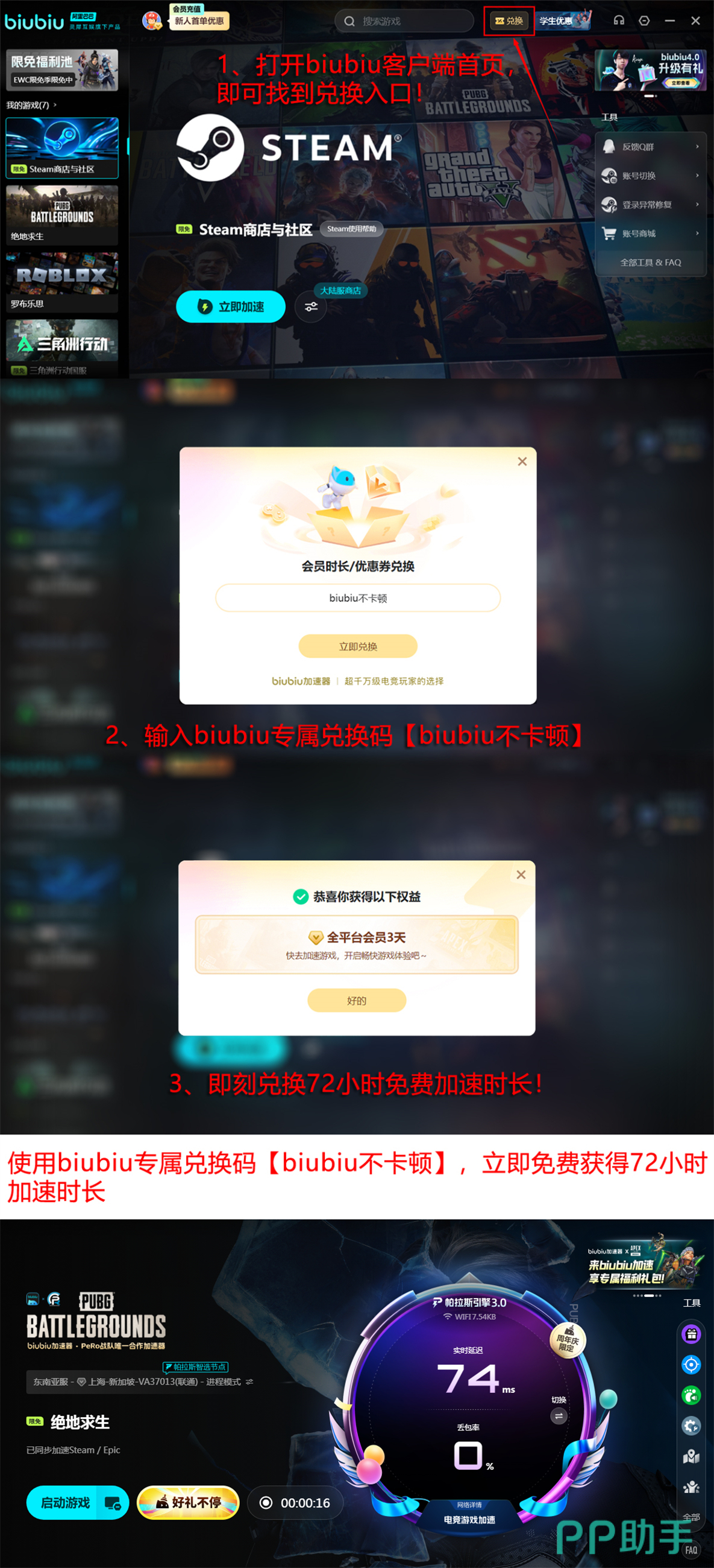 除性能优势外,biubiu同步提供实用型用户激励政策:输入兑换码【biubiu不卡顿】即可领取72小时全服加速时长,限每个账号使用一次;新注册用户默认享有24小时免激活加速权限,建议优先使用该权益,再激活兑换码,总计可获得96小时连续加速服务,综合成本显著低于常规订阅方案。