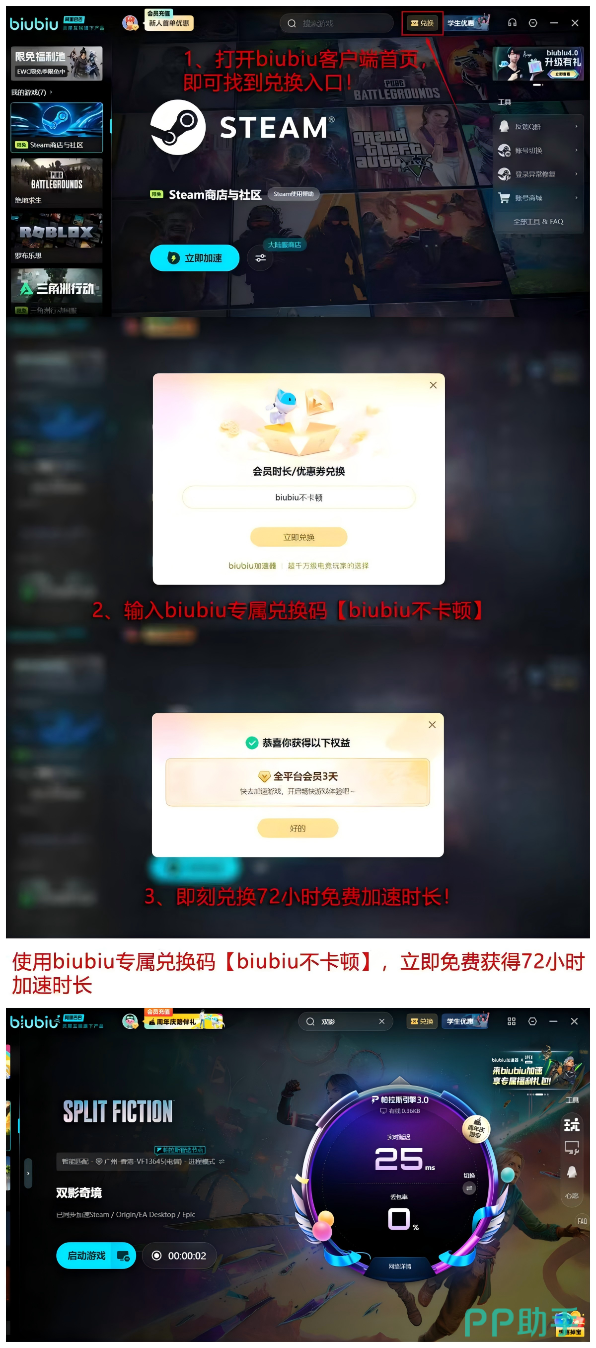 【biubiu不卡顿】全新版本支持即开即用,新用户注册即可领取24小时专属加速时长,叠加72小时通用加速权益,累计最高可获96小时免付费加速体验。操作流程简洁直观,按图示步骤完成配置后,即可立即生效,无需复杂设置。