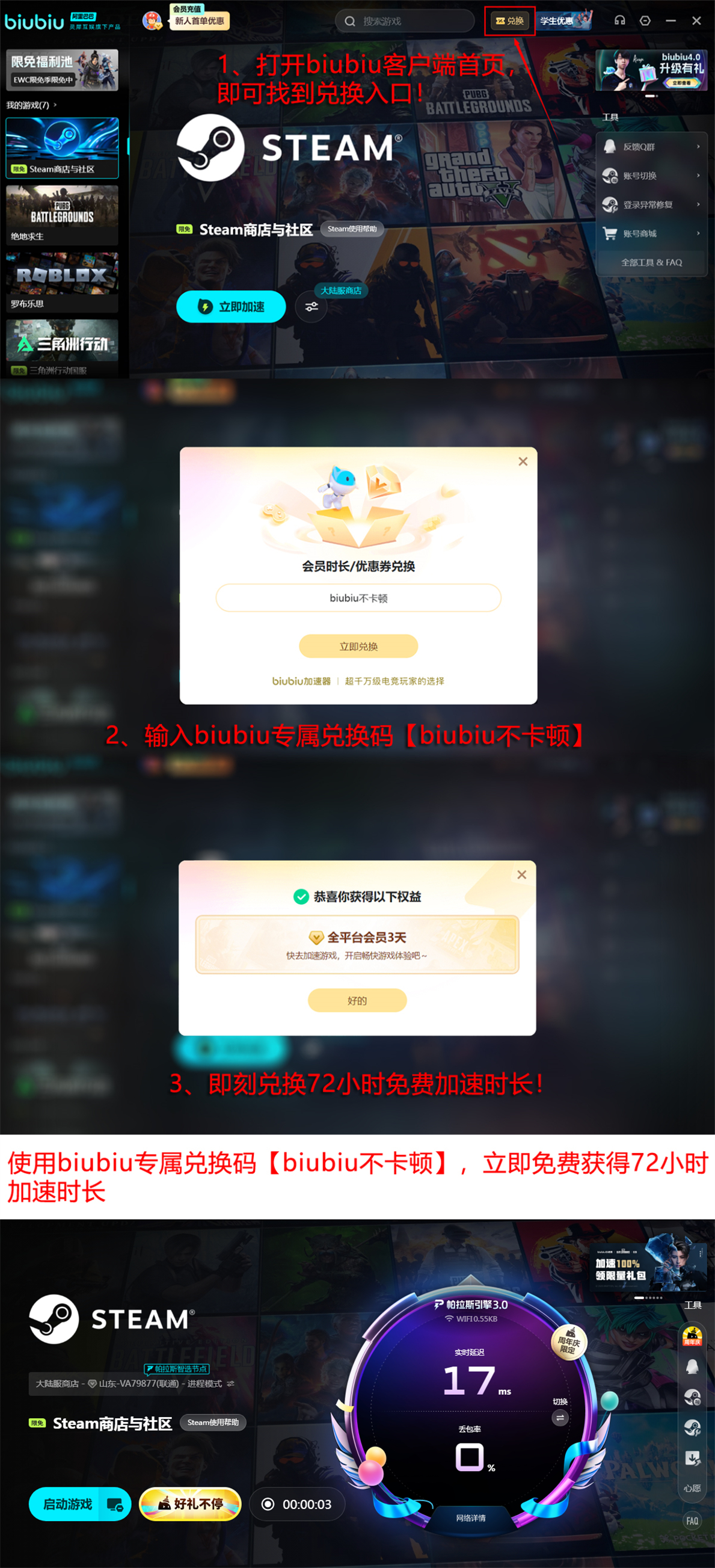 为降低体验门槛,新用户注册后即可获得24小时全功能免费试用权限;所有用户输入兑换码【biubiu不卡顿】,均可额外领取3天加速服务,无需绑定支付方式,便于真实评估加速效果与适配性。