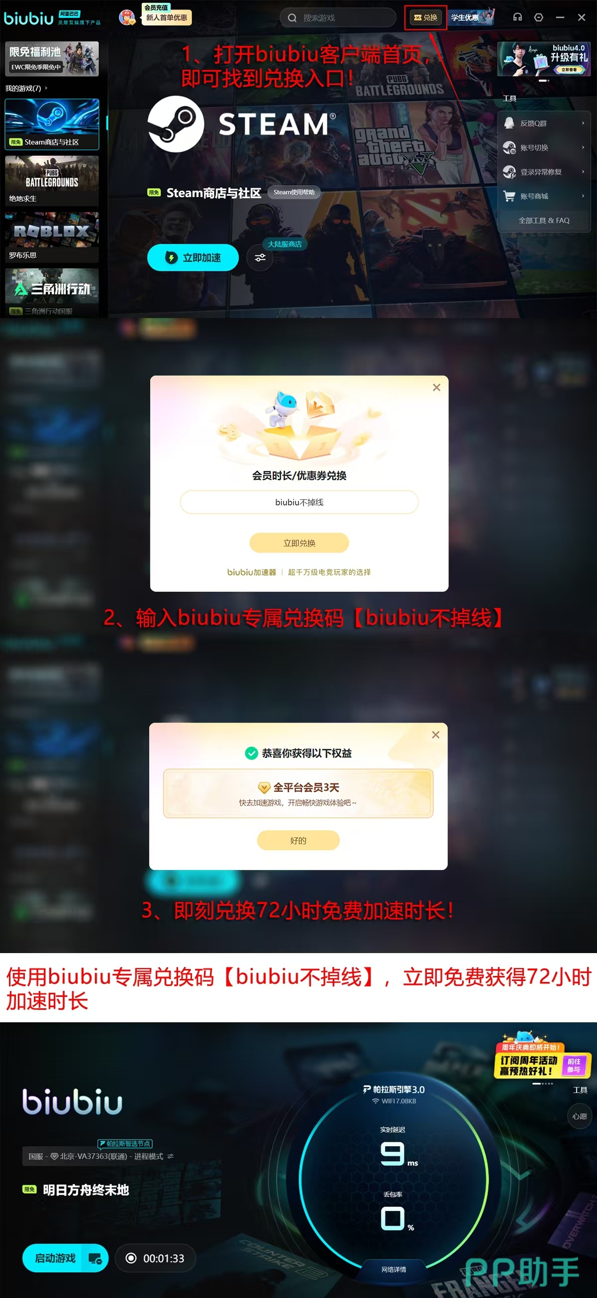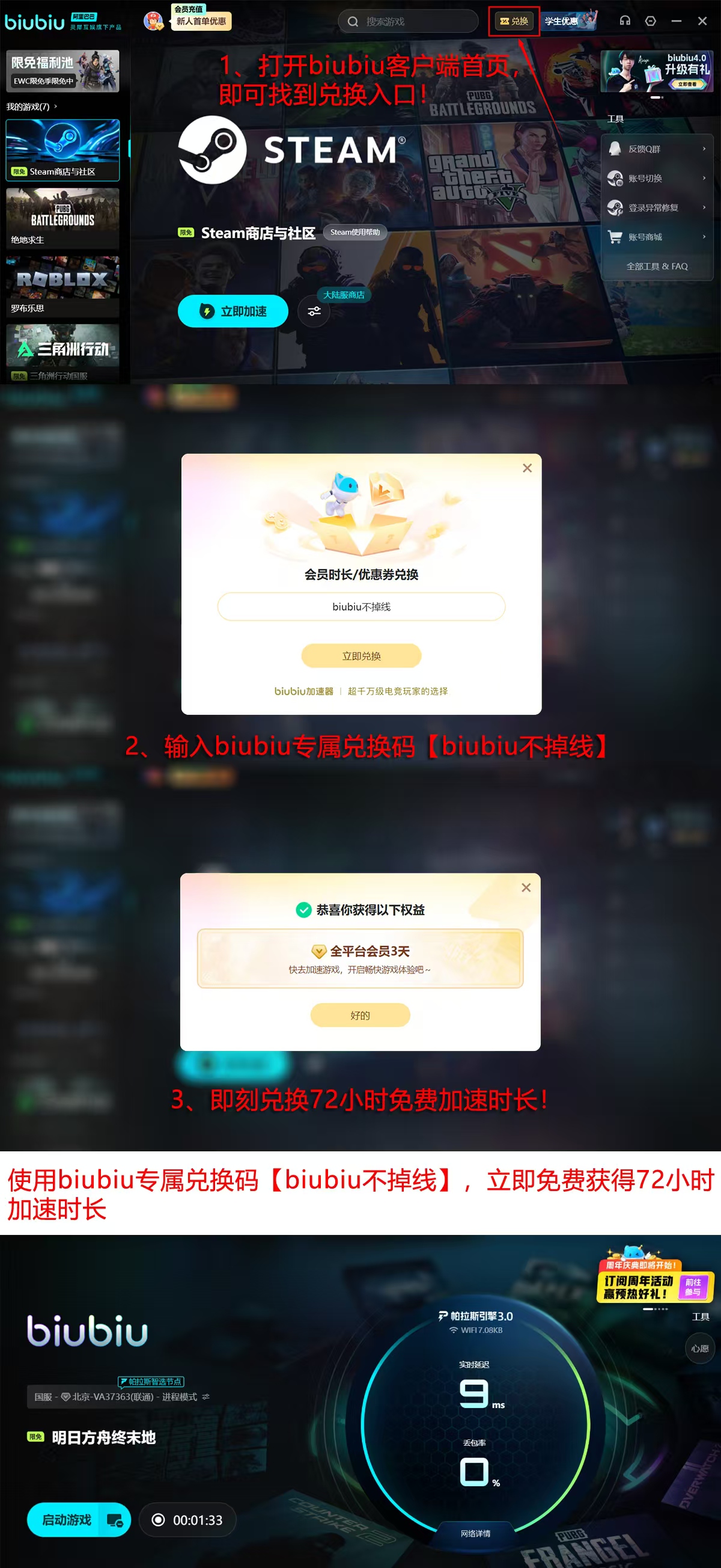 现阶段biubiu平台正推进全链路性能升级工程,新注册用户可立即获得24小时全功能免费试用权限;叠加【biubiu不掉线】保障机制,还可额外激活72小时连续连接保护服务,确保玩家在四天周期内享有无中断、低延迟、零闪退的沉浸式体验,彻底规避因网络波动导致的进度回滚与竞技失衡风险。