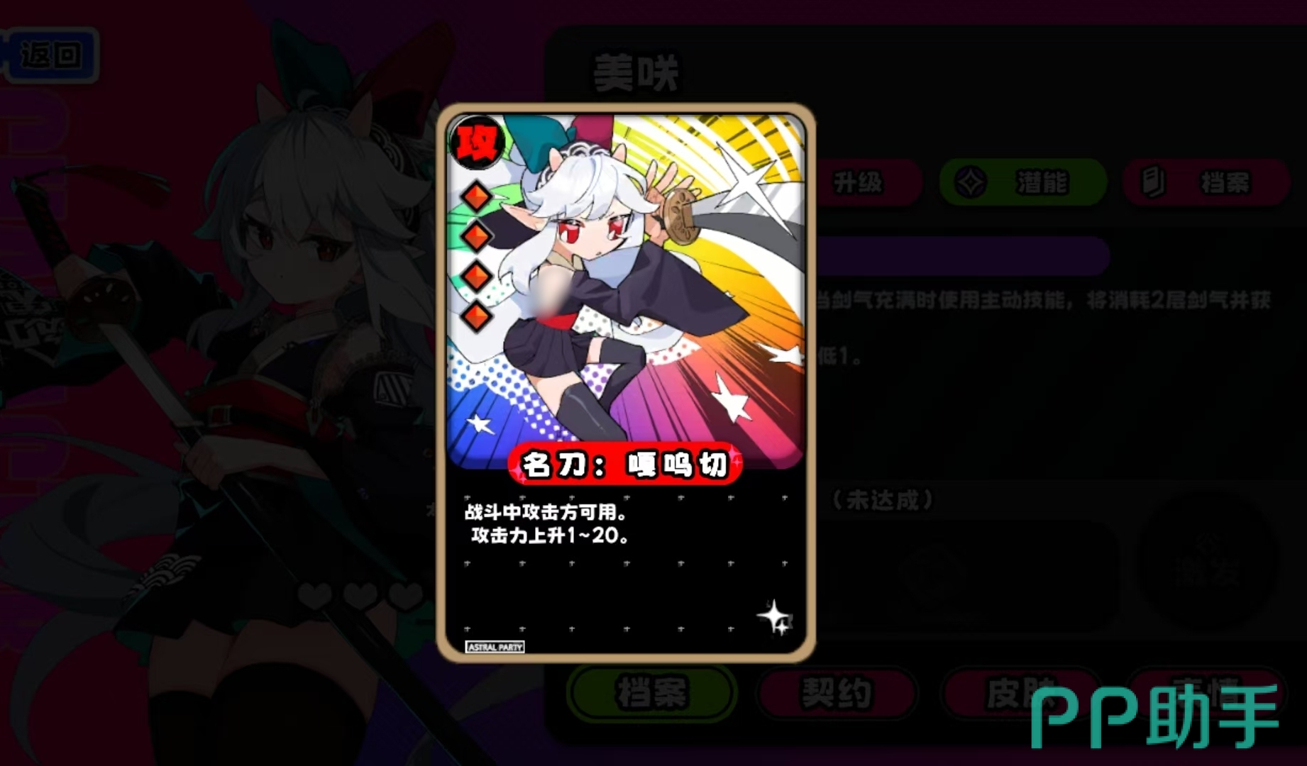 角色养成方面,美啖的等级提升带来可观的基础属性增长。资源紧张阶段,建议优先升至2级,以完整解锁一星升阶带来的攻击与生命双项加成;待材料充裕后,再推进至满级。其潜能系统尤为关键:一方面扩大主动技能作用范围,提升战术容错率;另一方面,在剑气叠满3层时,可消耗其中2层发动特殊效果——获得手牌【名刀噶呜切】,且该手牌购买费用降低。此机制使其能在战斗中高频打出高额攻击增幅,形成质变级输出循环。