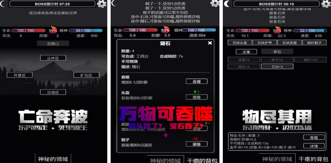 这是一款基于文本指令的生存模拟游戏,世界观设定在资源匮乏、危机四伏的荒野环境中。玩家需通过输入“采集”“建造”“狩猎”等关键词管理饥饿值、精神值与生命值三大核心状态。随机生成的天气系统、季节更替机制以及野生动物AI行为树,共同构成高自由度的生存沙盒。文字界面虽简朴,但信息密度高、反馈即时,营造出强烈的环境压迫感与生存紧迫感。