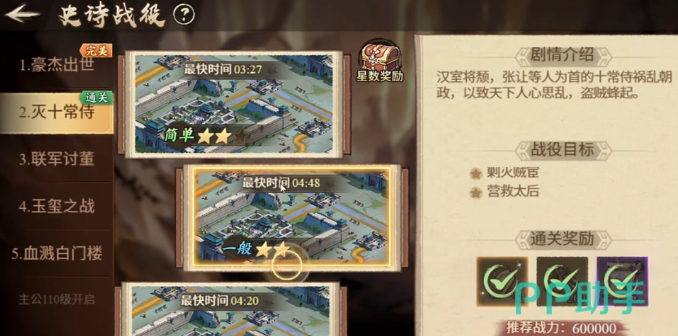 史诗战役共设普通、精英、地狱三档难度,每档独立结算星级,满星为三星。星级评定唯一依据为单场通关用时——时间越短,星级越高。三大难度累计总星数达标后,可开启专属稀有宝箱,内含武将进阶材料与关键养成资源,均为前期快速成型所必需。新手建议优先完成主线引导任务,熟悉基础操作与战斗规则。普通难度下,系统赠送的太史慈、黄忠、张飞已具备完整功能链:张飞承担爆发输出,太史慈提供稳定持续伤害,黄忠负责中远程压制,此三人组可通吃全部普通关卡。资源投入应聚焦核心,集中培养1至2名主力武将,避免分散养成。