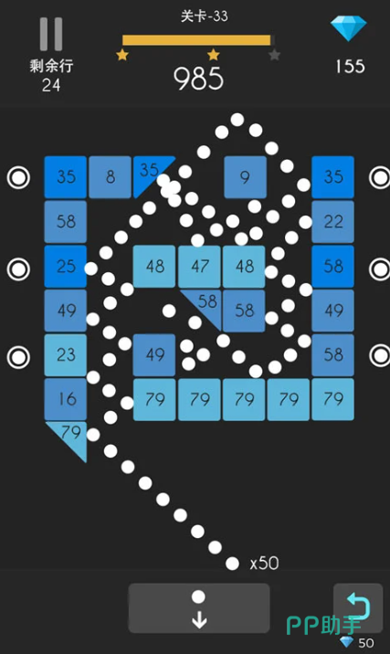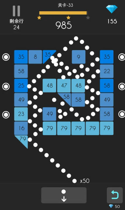 这是一款强调极简交互体验的竖屏休闲单机游戏。玩家操控白色弹球发射,撞击场景中带有数字标识的砖块——每个数字即为该砖块需被击中次数,归零后方可消除。过程中可拾取增益道具,例如分裂出额外小球、提升发射初速度等。通关核心逻辑清晰:在有限空间内,借助多球协同与精准弹道,清空全部目标砖块即可进入下一关。