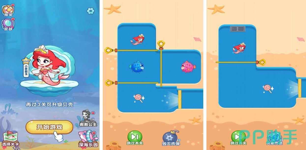 本作为益智解谜向休闲手游,核心机制围绕营救被困美人鱼展开。每一关卡均设置原创谜题,涵盖逻辑推理、物理规律应用、常识判断及情境联想等多元题型。答对题目可积累积分,累计达指定阈值后开启海洋宝箱,内含时间加速道具、金币加成卡及稀有皮肤兑换券等奖励。