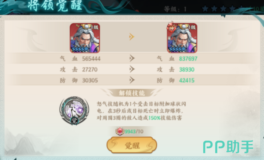 觉醒成功后,武将将获得显著属性增幅,尤其体现在怒气积攒效率、技能释放频次及战场控制能力上。不同武将因定位差异,觉醒后的实战表现亦有侧重——例如输出型武将怒气回复加快,辅助型则可能强化增益持续时间。首次觉醒需消耗10颗觉醒石,完成后角色头像右上角将显示“神”字标识,作为已觉醒状态的视觉凭证;该标识默认为白色,便于玩家快速识别阵容中已激活觉醒机制的单位。